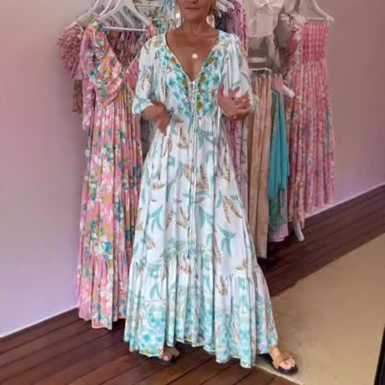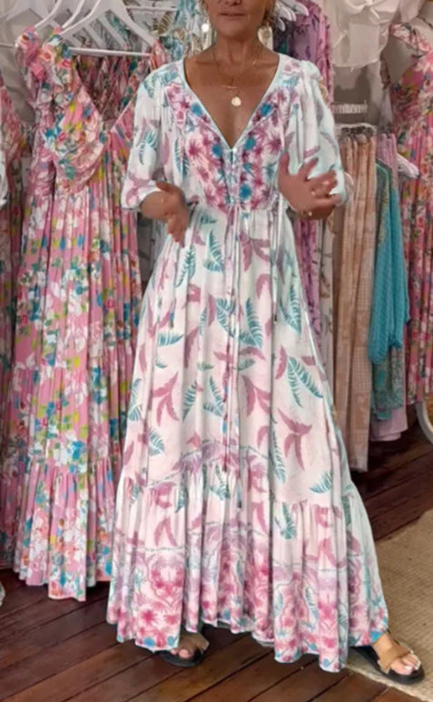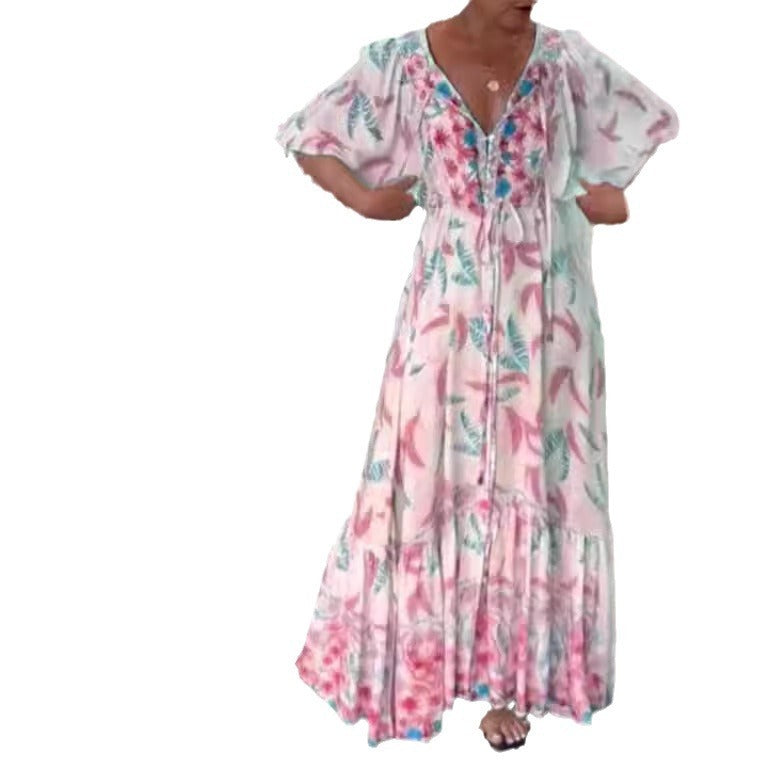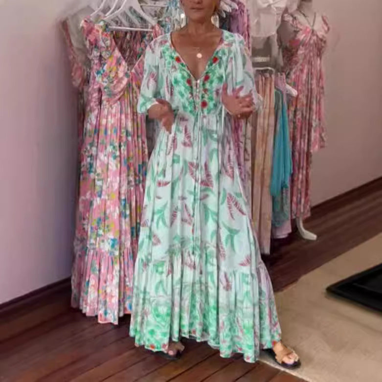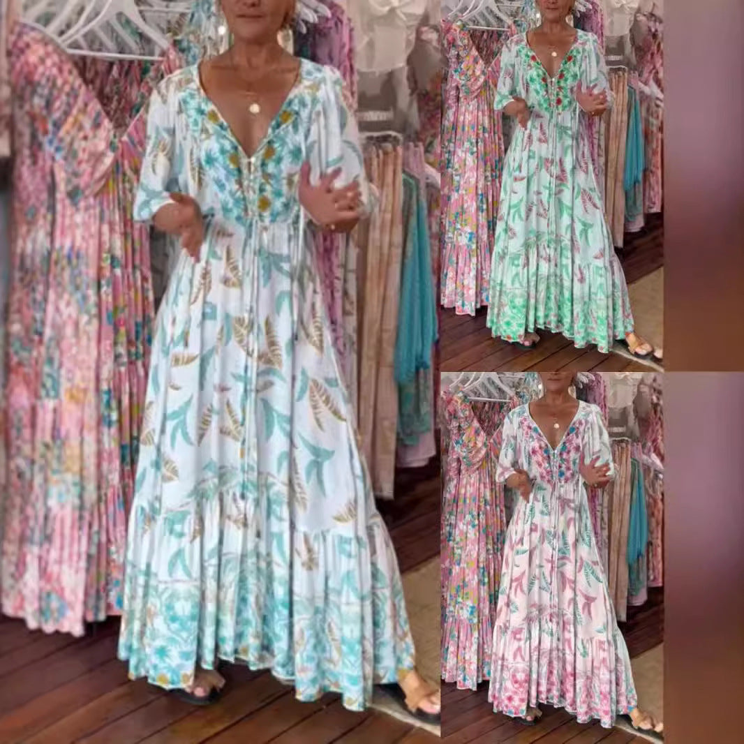 Casual Puff Sleeve Cardigan Deep V Dress Loose Plus Size