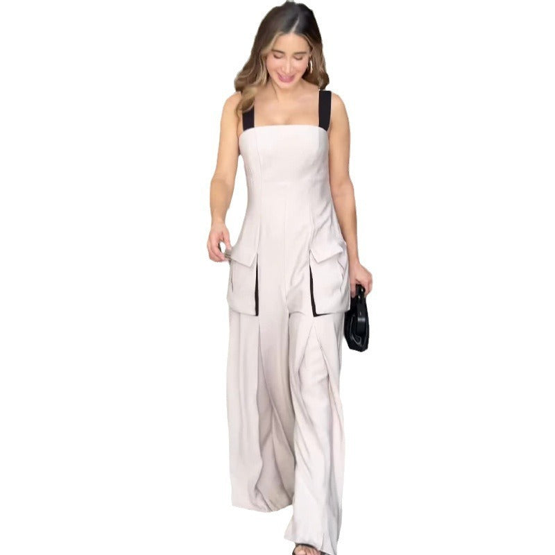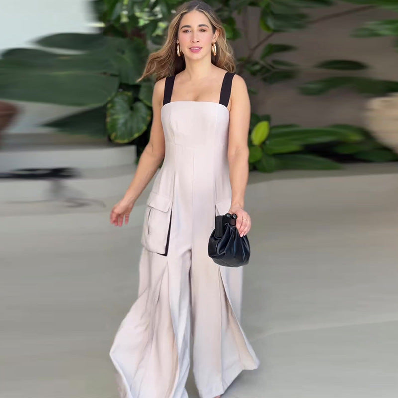 Contrast Casual Style Square Collar Sling Wide Leg Jumpsuit