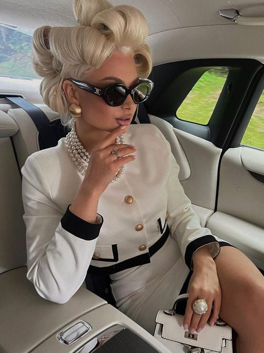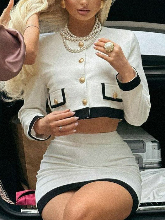 Contrast Color Single-breasted Cropped Jacket & Mini Skirt Set