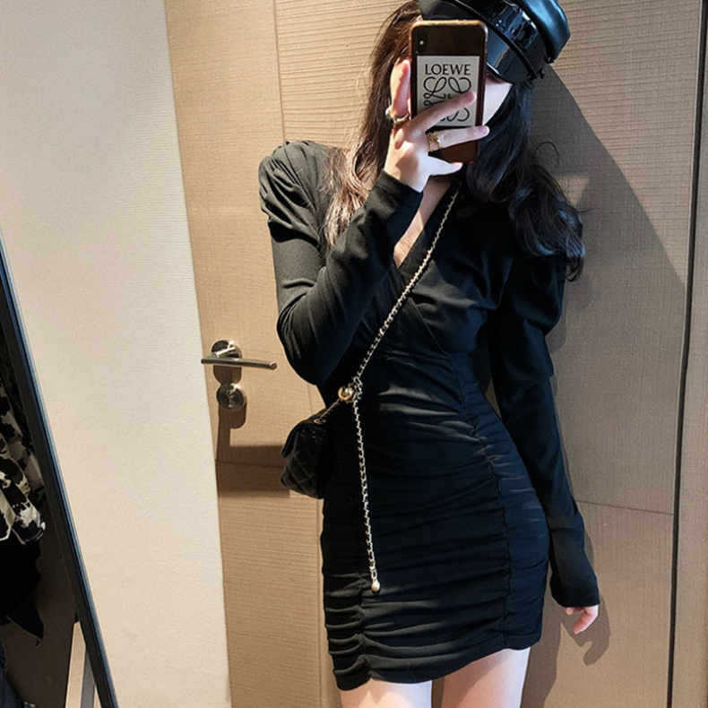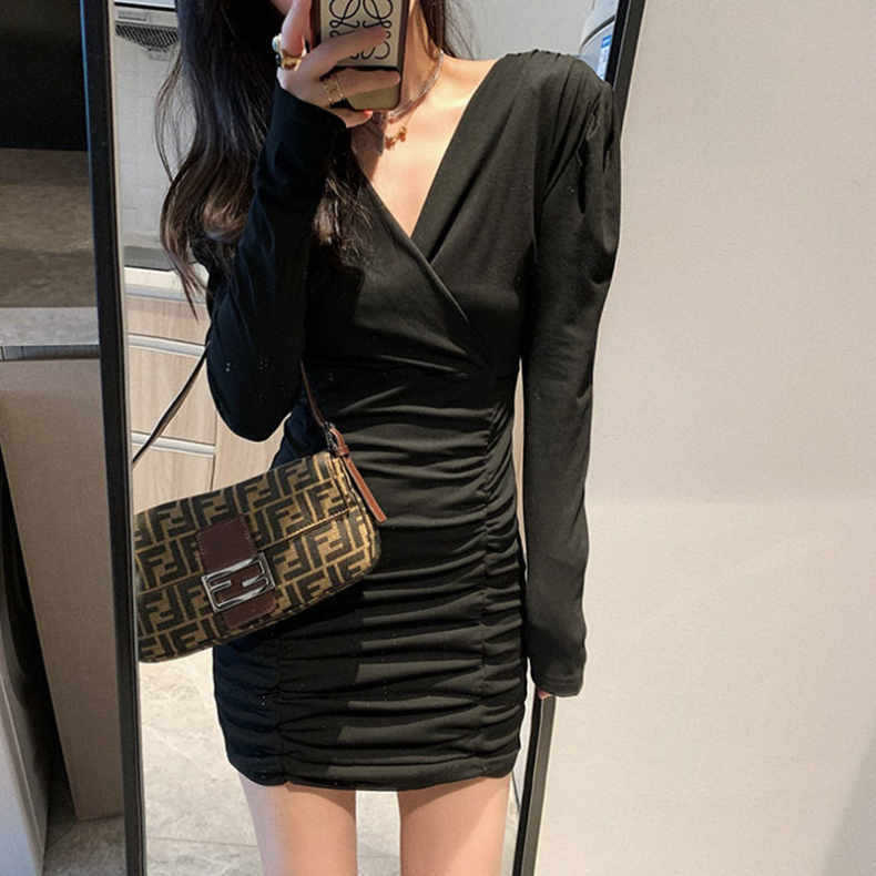 Early Autumn Women's Wear Cross V-neck Waist-tight High-grade Sense Black Dress
