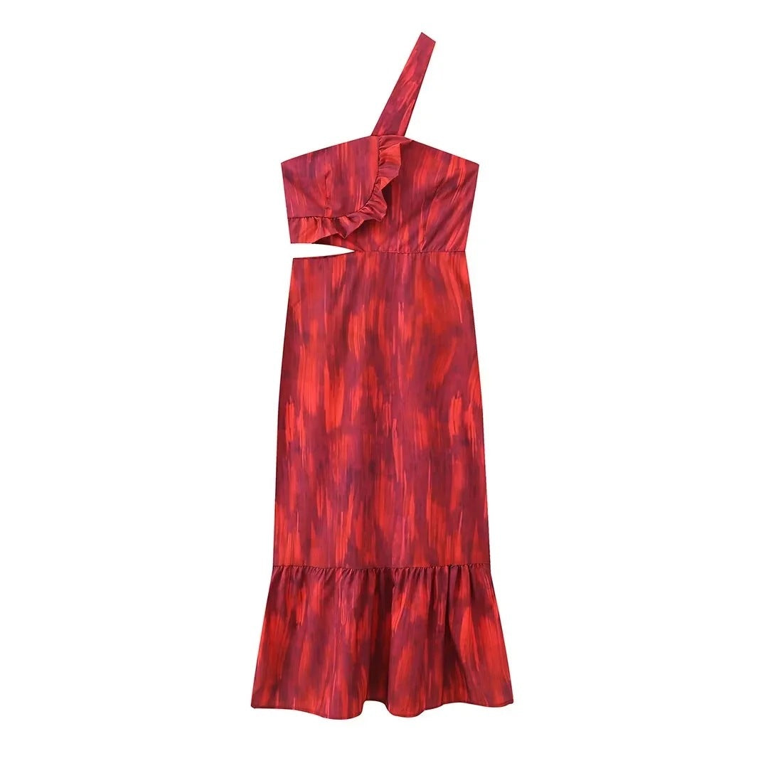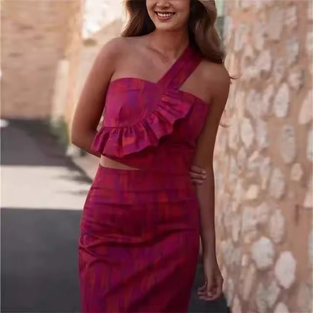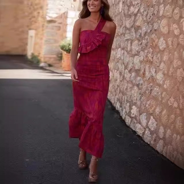 Women's Casual Slanted Shoulder Lotus Leaf Edge Suspender Dress