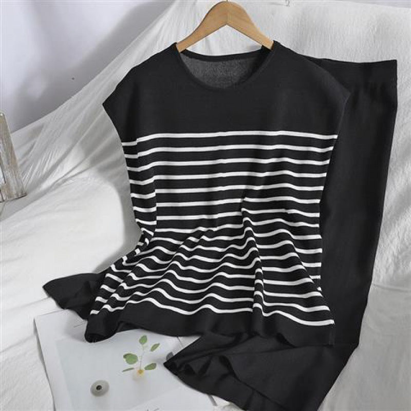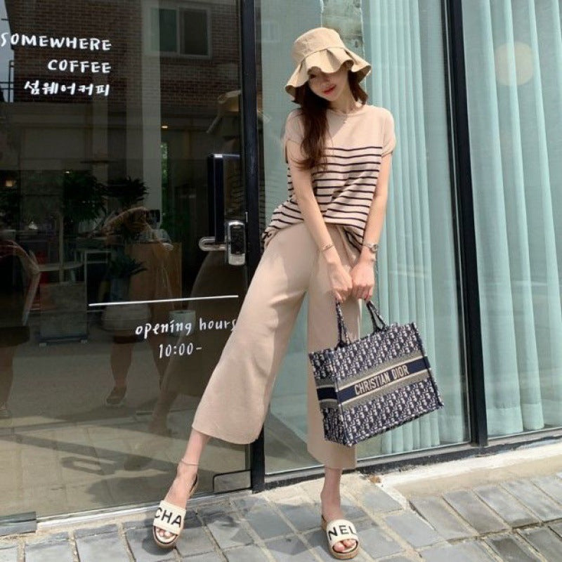 Women's Ice Silk Stripes Pullover Top Slimming Wide Leg Pants Knit Two-piece Suit