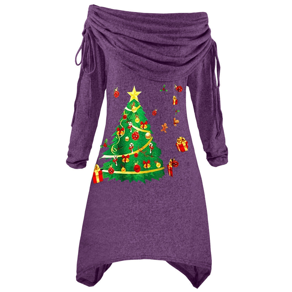 Women's Long Sleeve Christmas Tree Print Pleated Collar Irregular Dress