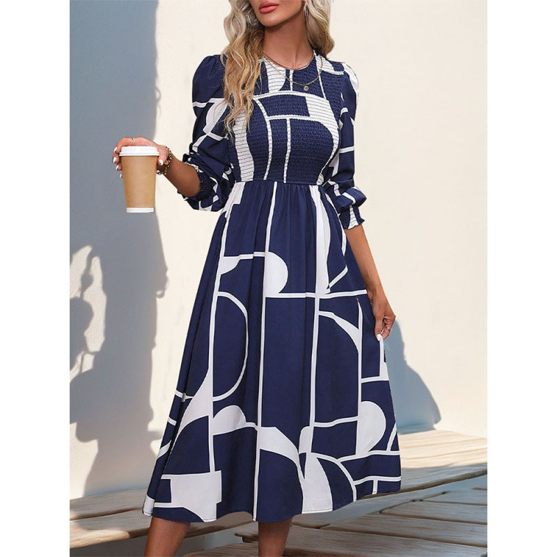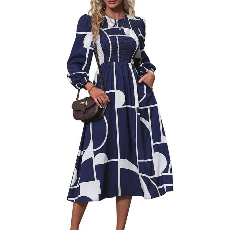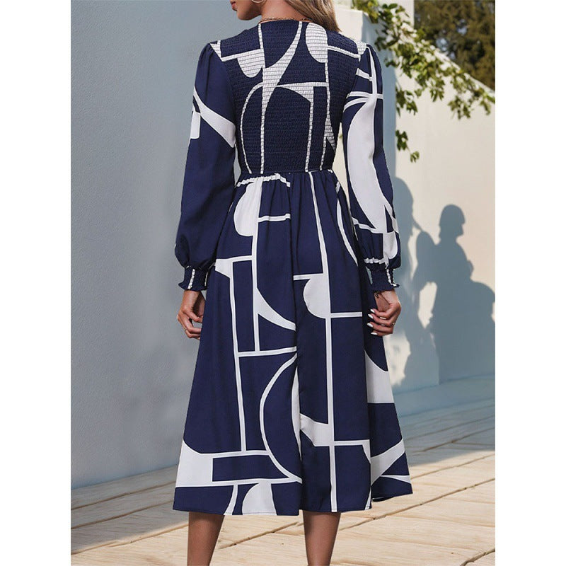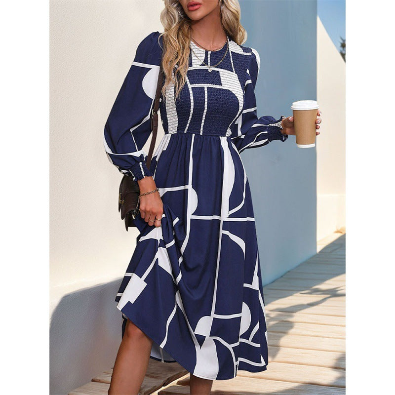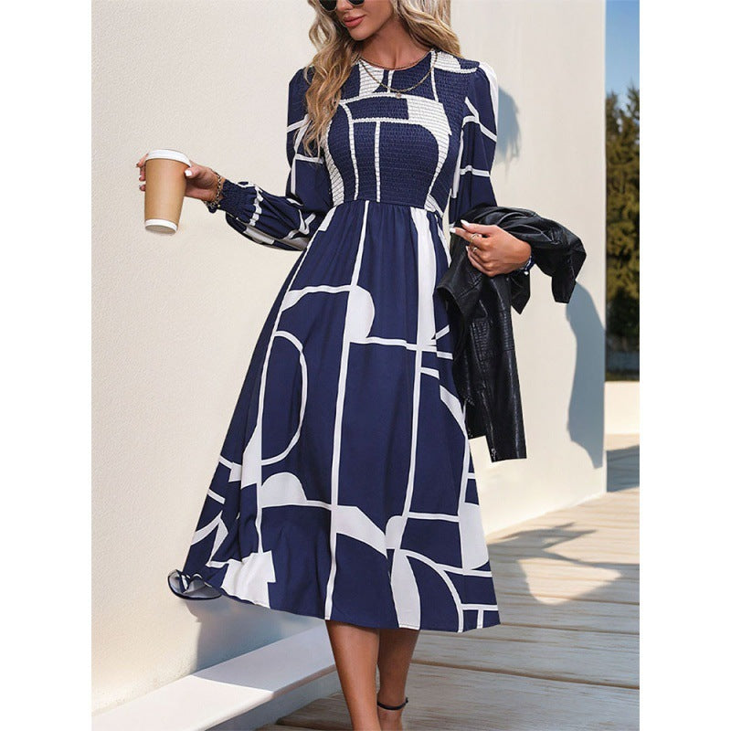 Women's Long-sleeved Printed Dress A- Line Skirt