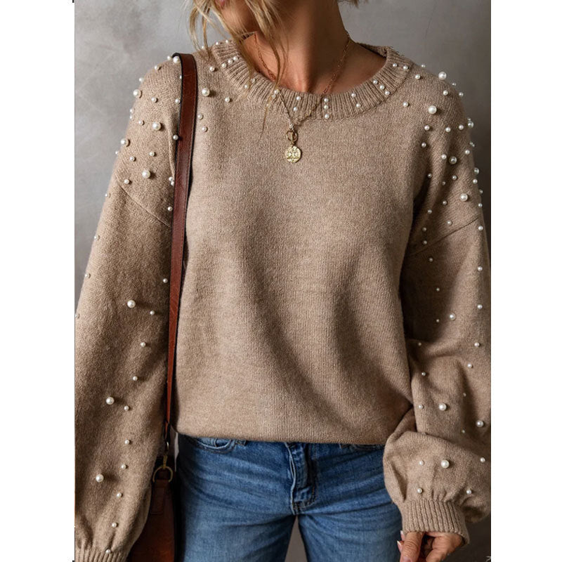 Women's Loose Beaded Round Neck Pullover Long Sleeve Sweater