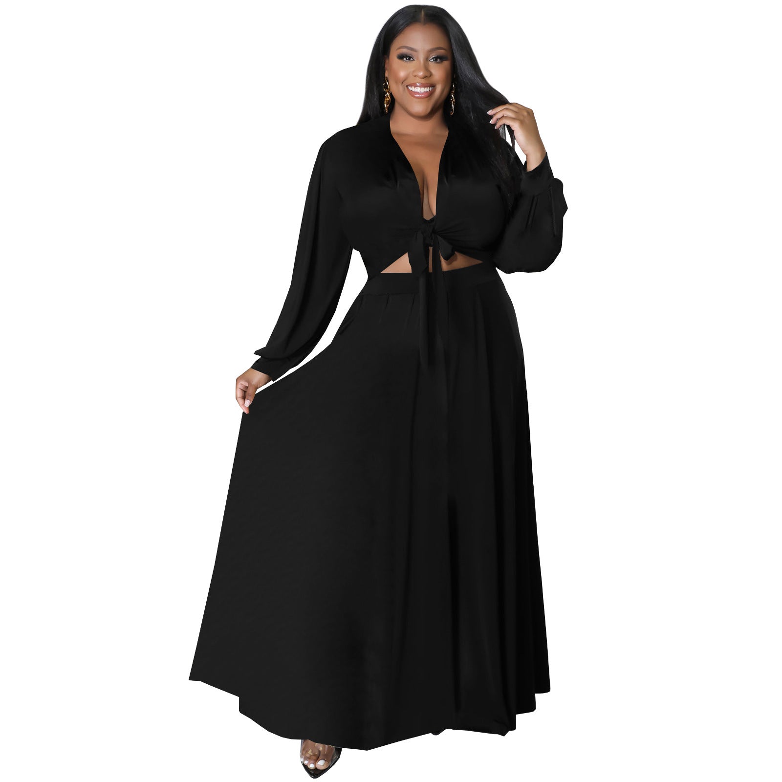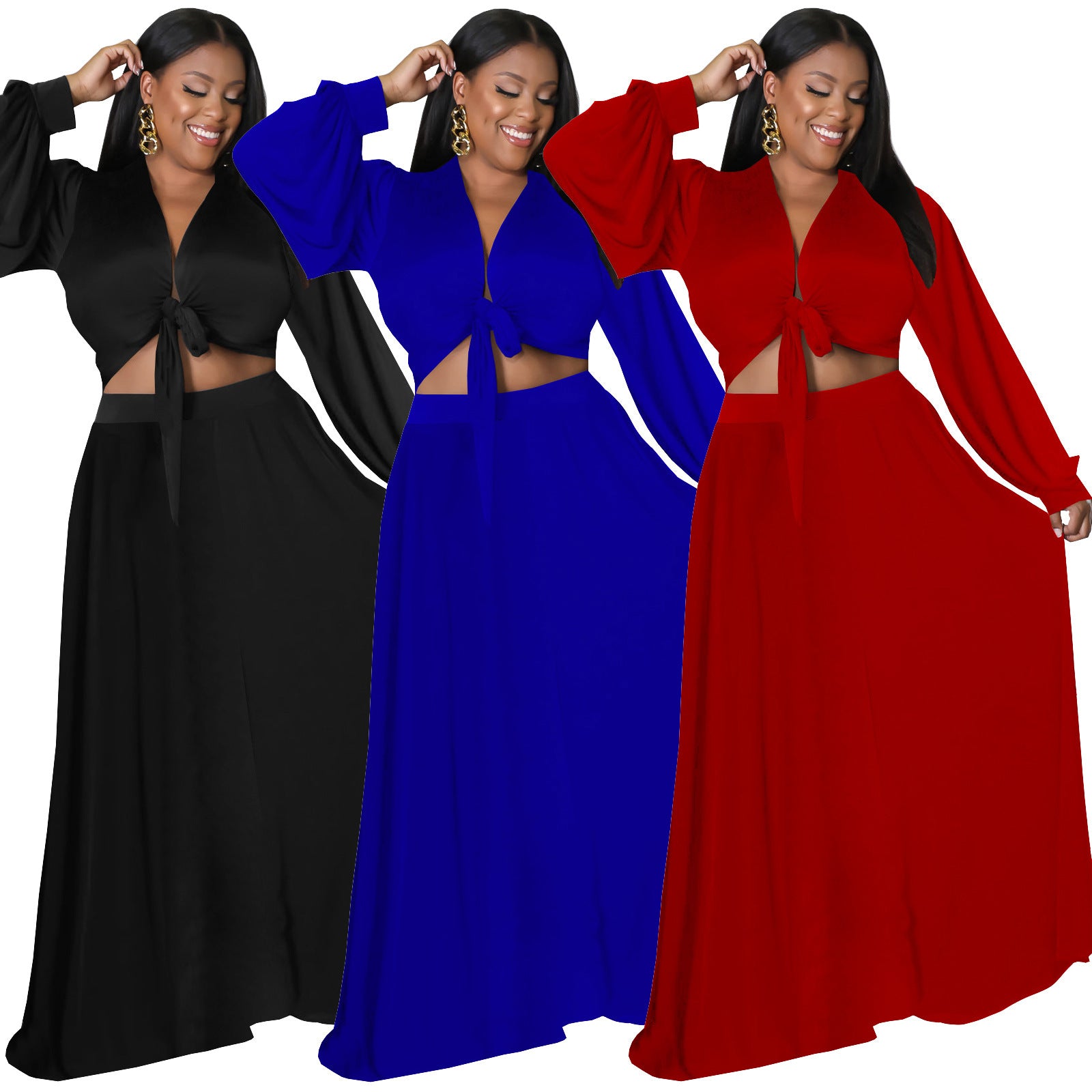 Women's Solid Color Cotton Tied Long Sleeves Swing Skirt Suit