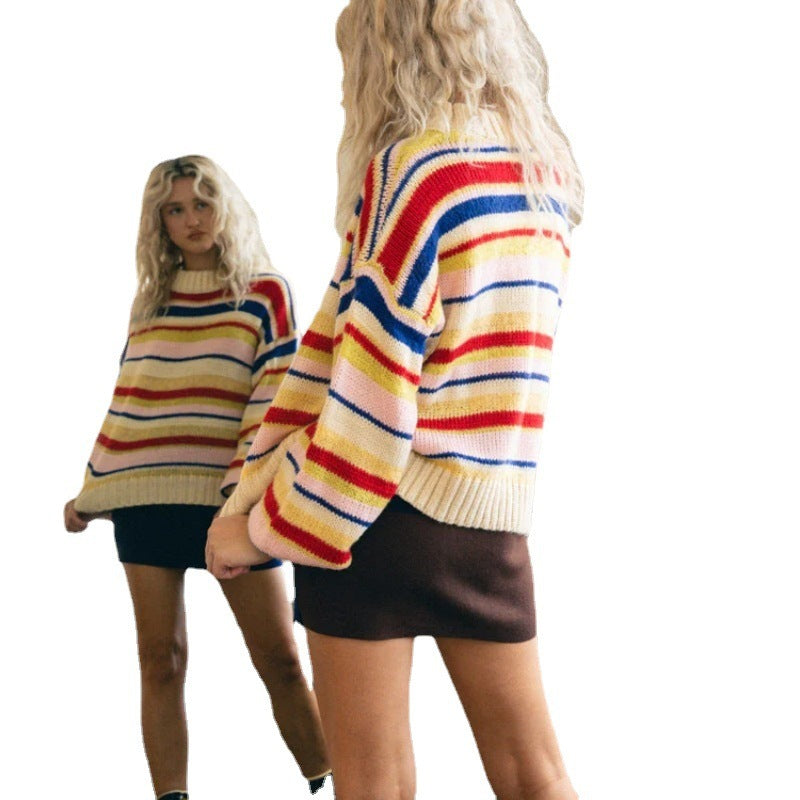 Women's Stand Collar Contrast Color Striped Pullover Sweater