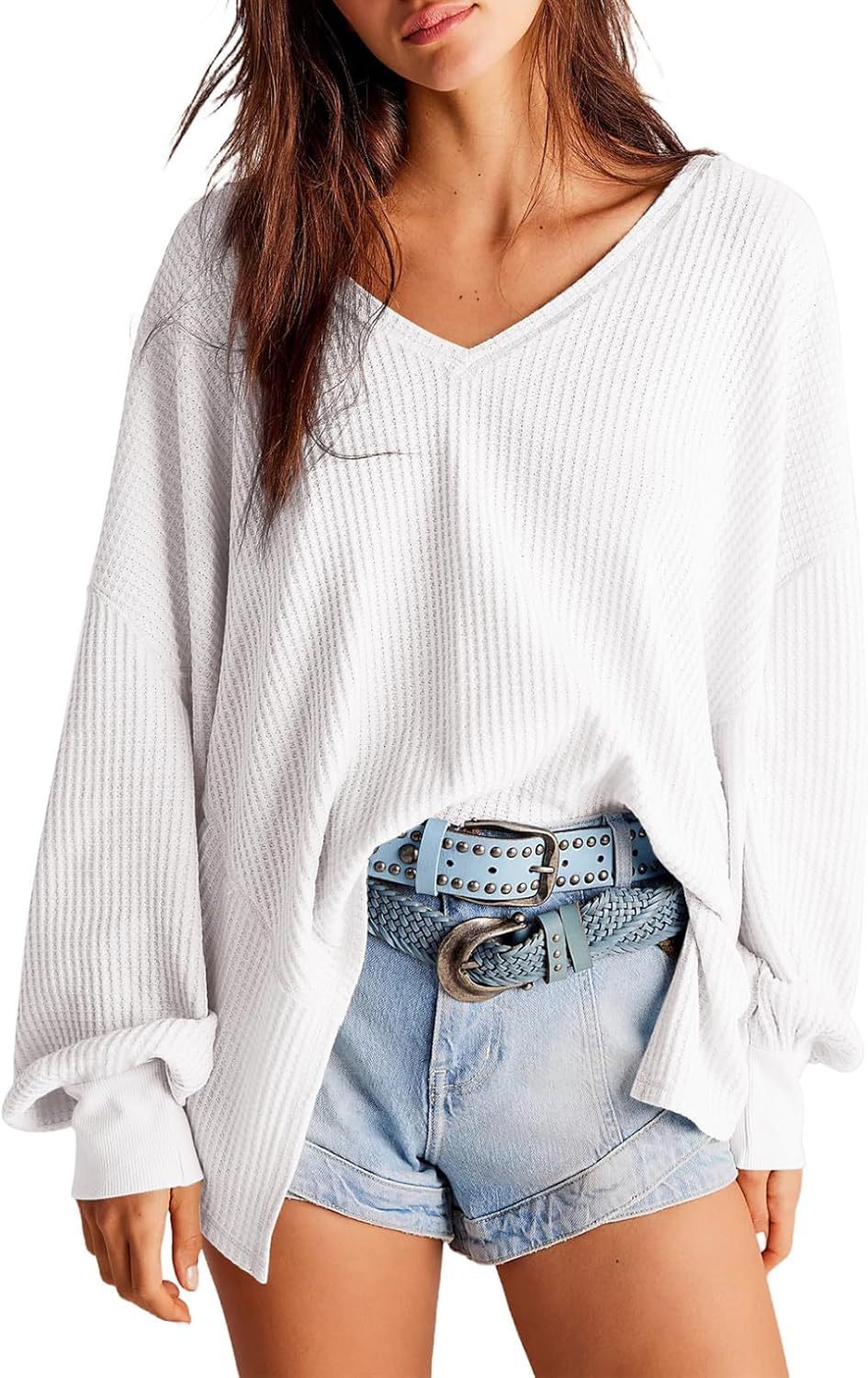 Women's Waffle Knit Blouse Lantern Sleeve Casual Shirt